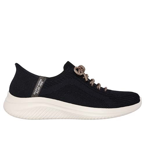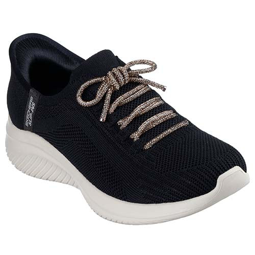 Lækker Slip-ins Ultra Flex 3.0 - Diamond Dreamer sko med en overdel af åndbart, teknisk strikket tekstil dekoreret med rhinstenspyntet No Tie Fit™-snørebånd. Med den bløde og elastiske Stretch Fit® tilpasser overdelen sig foden som en strømpe. Med Slip-ins får du Skechers’ håndfrie teknologi, hvor du nemt kan træde i skoen uden at bruge dine hænder eller at bukke dig, og du får en fast hælkappe med en specialdesignet Heel Pillow™, der former sig til din hæl og dens naturlige kurve samt holder foden sikkert på plads. Skoen har en udtagelig Air-Cooled Memory Foam-indersål, som former sig efter din fod og dæmper stød hele dagen, og den fleksible ydersål er stødabsorberende med et fint fodfæste. Her får du en afslappet og let sko, hvor komfort og bekvemmelighed er i top - perfekt til gåture og hverdagsbrug. Er fremstillet af 100 % ikkeanimalske materialer. Fås i halve størrelser.