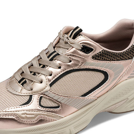 Lækker sneaker med en overdel af glittertekstil og metallisk syntet i en flot farvekombination. Skoen lukkes med snørebånd, og trækfaner på hæl og pløs gør det nemt at træde i skoen. Åbningen er polstret for øget komfort. Den udtagelige indersål er polstret, blød, støddæmpende og komfortabel, og den kraftige EVA-ydersål med gummibelægning er stødabsorberende med et godt fodfæste. 100 % vegansk.