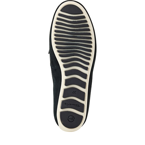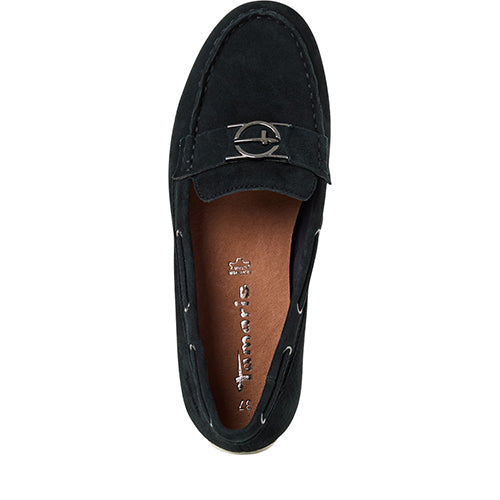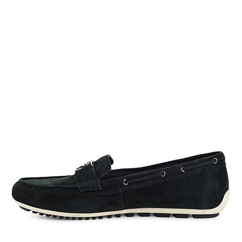 Lækker loafer med en overdel af ruskind med en rem med et mørkegråt metallogo, og kanten er dekoreret med et pyntebånd gennem metalfarvede øjer. Den udtagelige indersål er støddæmpende, polstret og komfortabel og beklædt med skind, og sammen med det bløde tekstilfoer får foden et godt klima. Den karakteristiske gummiydersål er meget fleksibel samt stødabsorberende med et godt vejgreb, og den er forlænget et stykke op ad hælen for ekstra slidstyrke. Skoen er meget let. Her får du et par loafers perfekt til både hverdag og fest.
