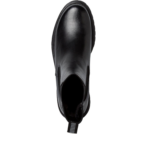 Pæn Chelsea-støvle af glat skind og med de klassiske elastikpaneler på siderne. Trækfanen på hælen gør det nemt at træde i støvlen. Indvendig har støvlen et blødt, lunt foer, og indersålen er blød og polstret for øget komfort. Den grove ydersål af gummi er stødabsorberende med et godt fodfæste.