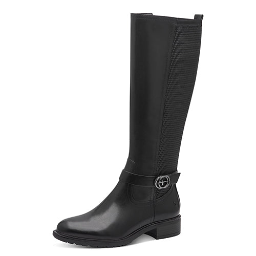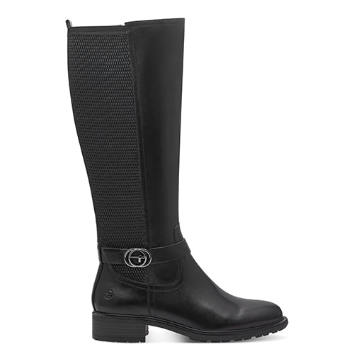 Lækker langskaftet støvle med et elastisk XL-skaft, der tilpasser sig bredere lægge. Overdelen er af glat skind og elastisk syntet dekoreret med en ankelrem og pyntespænde. Støvlen lukkes med en lynlås på indersiden. Indvendig på skinddelen har støvlen et let og lunt fleecefoer, og indersålen er komfortabel. Ydersålen og den 3,5 cm høje blokhæl belagt med gummi har et godt mønster for et forbedret fodfæste.