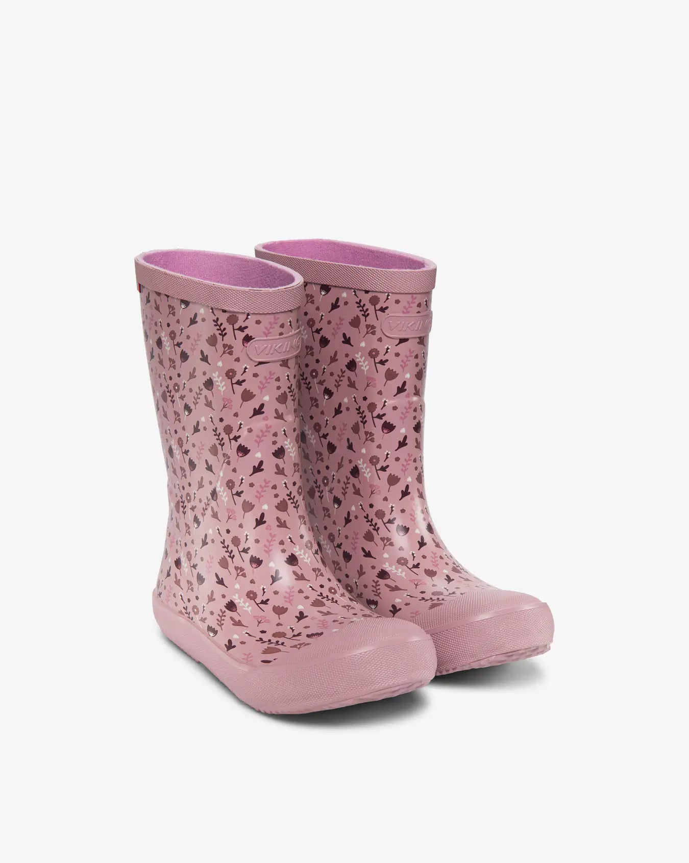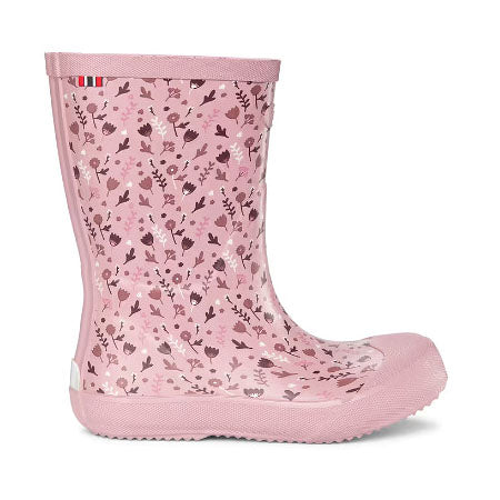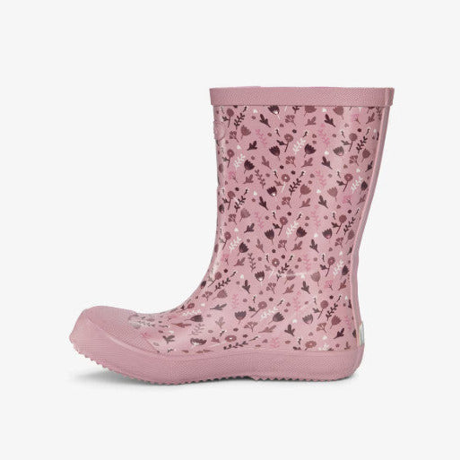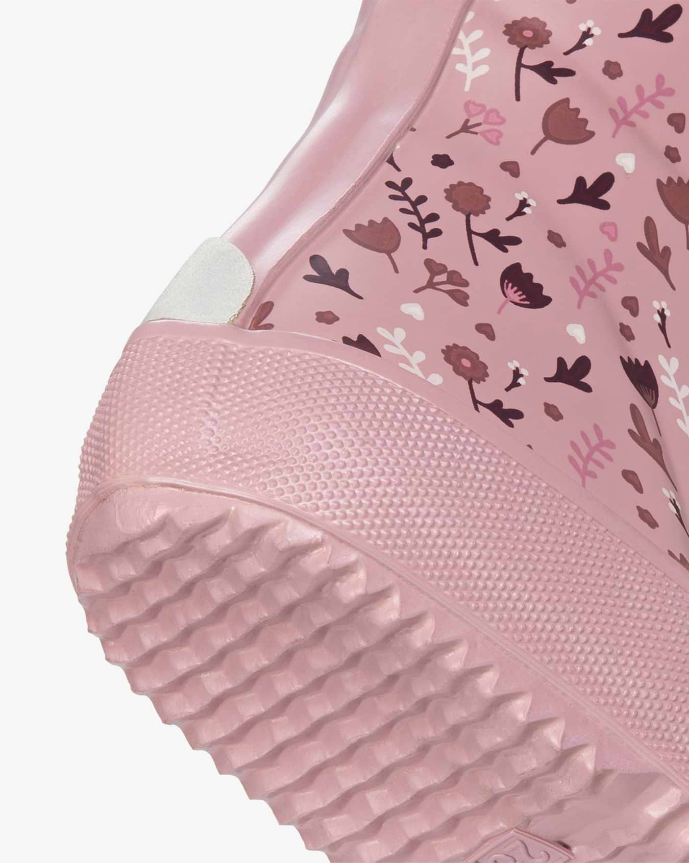 Sød Indie Print gummistøvle med blomstermotiv samt tå- og hælforstærkning og en opdateret moderne form. Gummistøvlen er håndlavet af elastisk og slidstærkt naturgummi, og indvendig har støvlen et hurtigttørrende polyesterfoer. En udtagelig, ergonomisk EVA-indersål sørger for isolering, polstring og komfort, imens ydersålen med det rillede mønster giver et fint vejgreb uden at lave mærker på gulvet. Refleksdetalje på hælen øger barnets synlighed. Støvlen er nem at tage af og på og gør regnvejrsdage lidt sjovere!