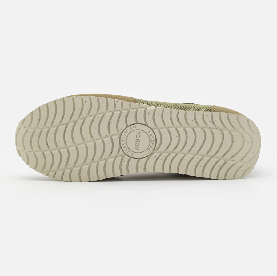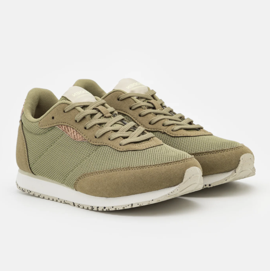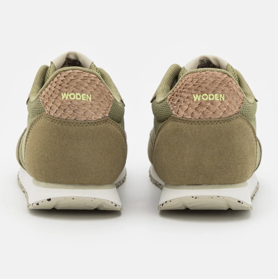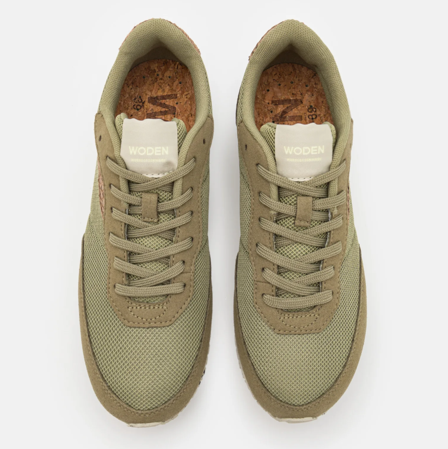 Fleksibel og åndbar Signe sneaker fra Woden. Overdelen er tekstil med detaljer af fiskeskind på hælen og ved snørebåndet. Skoen justeres og lukkes med snørebånd, og den karakteristiske WODEN korksål kan tages ud. Ydersålen af gummi giver et godt fodfæste.