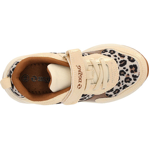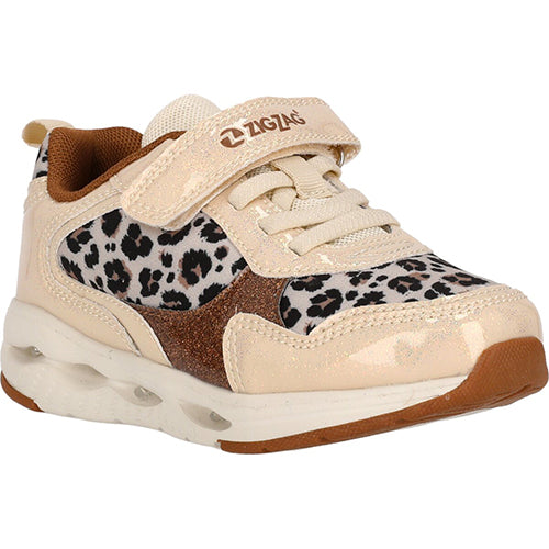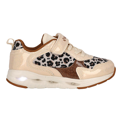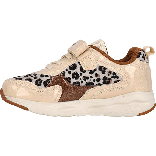 Certiny Kids Shoe w/ Lights er en superflot sneaker med blink i ydersålen og en overdelen af tekstil med leopardprint og glat syntet med glimmer. Skoen lukkes med en velcrorem over vristen, imens en ikkejusterbar elastiksnøre sørger for tilpasning til foden i løbet af dagen. En trækfane på hælen gør det nemt at få skoen på. Åbningen er polstret for øget komfort og beskyttelse, og den udtagelige indersål er komfortabel. Den støddæmpende mellemsål har blink på ydersiden, og ydersålen med gummibelægninger er stødabsorberende med et fint fodfæste.