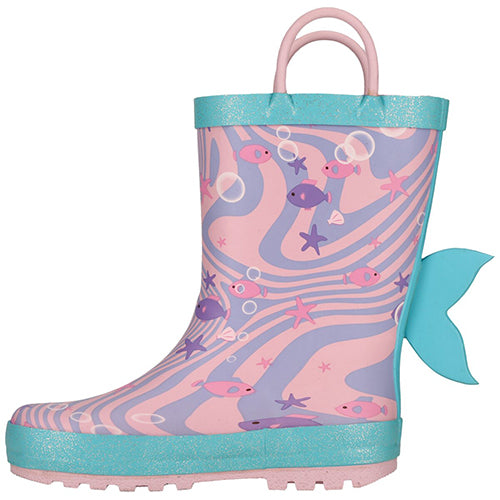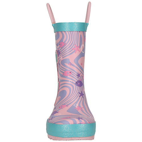 Superfin Rook Kids - Sweet Lilac gummistøvle med et unikt havdesign med fisk, søstjerner og en havfrue på ydersiden samt en fiskehale på hælen er både praktisk og sjov, perfekt til leg i regnvejret. Gummistøvlen er udstyret med håndtag i toppen, der gør det nemt for de små selv at tage den af og på. Overdelen er af slidstærkt gummi, som holder fødderne tørre i vådt vejr. Den indvendige tekstilforing sikrer behagelighed, og den udtagelige indersål er blød og komfortabel. Den fleksible, semigrove gummiydersål er stødabsorberende med et solidt greb på glatte og våde underlag. Rook Kids gummistøvlen er ideel til daglige udendørsaktiviteter og til at holde små fødder komfortable og tørre i alt slags vejr.